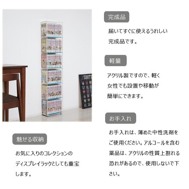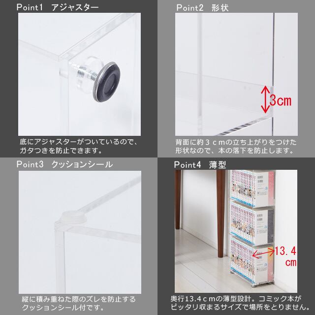 ◆奥行13.4cmの薄型設計ですので、コミック本がピッタリ収まるサイズで場所をとりません。