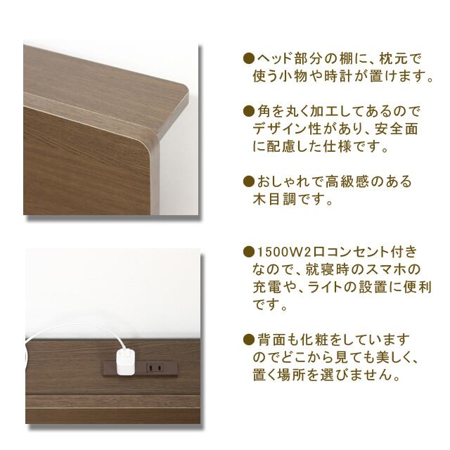 ◆ヘッド部分の棚に、枕元で使う小物や時計が置けます。
