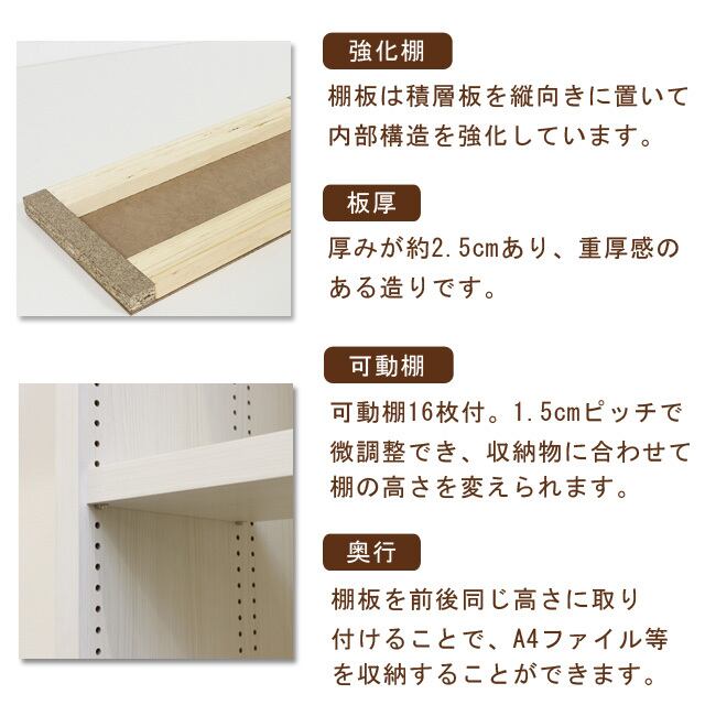 ◆棚板を前後同じ高さに取り付けることで奥行ができ、A4ファイル等を収納する事もできます。
